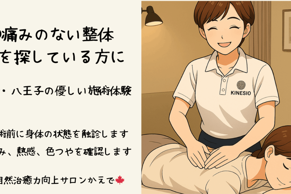 整体で「痛い」と感じて通えない、肩こりや腰痛が改善しない、もみ返しで逆に疲れる…そんな悩みを持つ八王子市・日野市の方へ。ボキボキ整体が苦手でも安心できる、痛みのないやさしい施術体験をご紹介します。 整体で「痛い」と感じて… 続きを読む »痛みのない整体を探している方へ|日野・八王子のやさしい施術体験