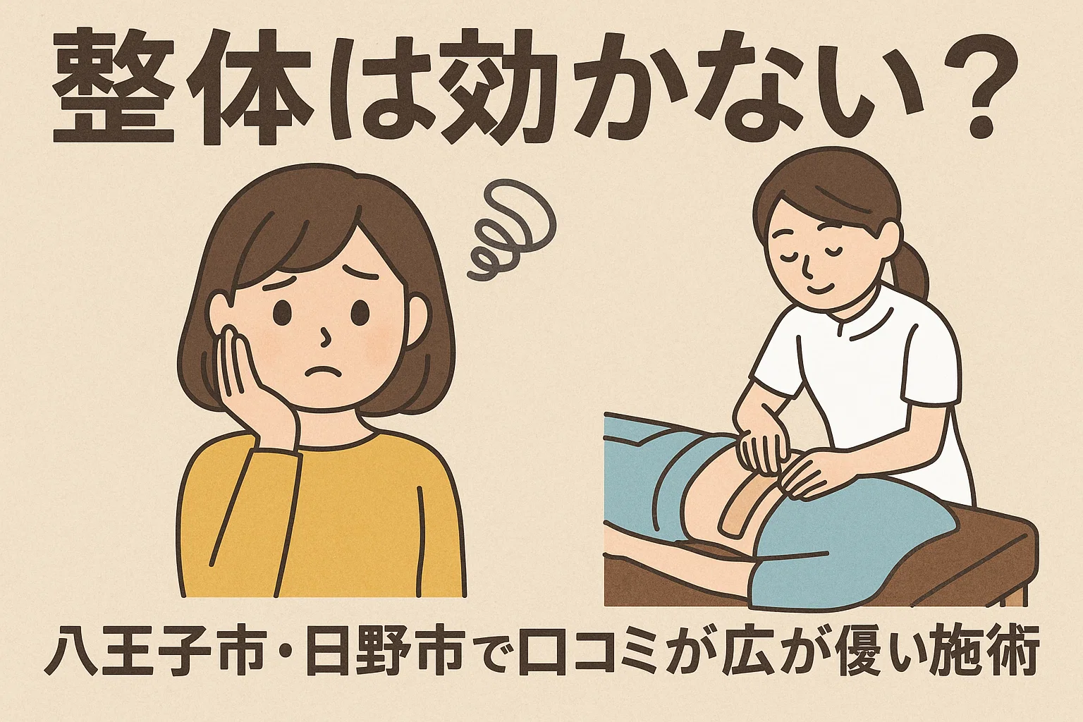 整体は効かない、肩こりや腰痛が改善しない、もみ返しがつらい…そんな不満を持つ日野市・八王子市・立川市周辺の方へ。ボキボキ整体が苦手でも安心できる、口コミで広がる優しい施術をご存じですか。 整体は効かないと感じる人が多い理… 続きを読む »整体は効かない?八王子市・日野市で口コミが広がる優しい施術