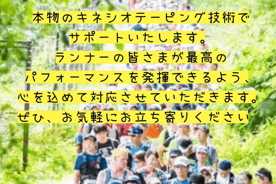🌲✨ 第10回 赤城の森トレイルラン大会 キネシオテーピングサービス報告 ✨🌲 昨日、赤城の森トレイルラン大会にて、キネシオテーピングの無料サービスを実施いたしました。当日は朝7時からスタッフ10名で対応し、レーススター… 続きを読む »🏃♀️報告🏃♂️第10回 赤城の森トレイルラン キネシオテーピングサービスと受講生募集