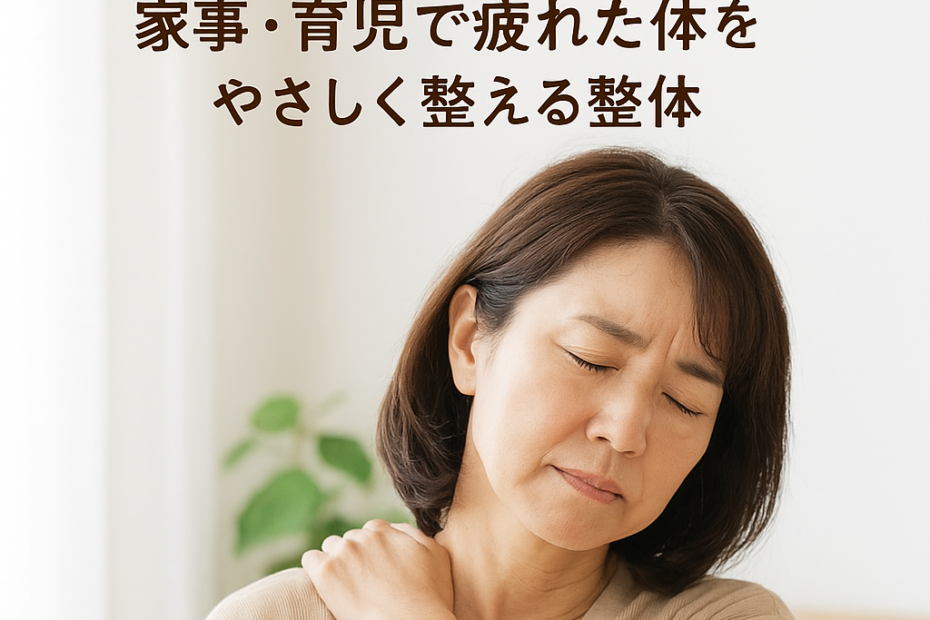 朝起きてから夜寝るまで、家事や育児、家族のサポートで一日があっという間。ふと気づくと「肩が重い」「首までガチガチ」「最近疲れが抜けない」そんな状態が当たり前になっていませんか? 実は、主婦の方の肩こりは“がんばりすぎのサ… 続きを読む »家事や育児で肩こりがつらい主婦の方へ|毎日が少し楽になる体の整え方